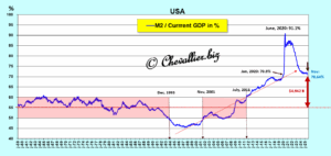 Cette baisse du ratio M2/PIB ne se répercute même pas sur le (même type de) ratio calculé à partir de la reconstitution de l’agrégat monétaire M3 par rapport au PIB (en pourcentage) noté M3r car l’agrégat monétaire M3-M2 continue à augmenter, cf. article à venir,