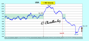 Cependant, il faut bien comprendre que cette augmentation de l’agrégat monétaire M2 a pu baisser parce que les Américains ont globalement un peu moins d’argent sur leurs comptes bancaires (M1) et sur leurs comptes d’épargne (M1-M2) !