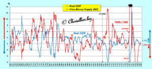 Plus précisément, c’est la variation de ce que j’appelle la masse monétaire libre M2, qui est la différence entre, d’une part la variation (d’une année sur l’autre en pourcentage) de l’agrégat monétaire M2, et d’autre part (moins) la variation du PIB réel (d’une année sur l’autre en pourcentage), qui provoque une réaction inverse du PIB réel.