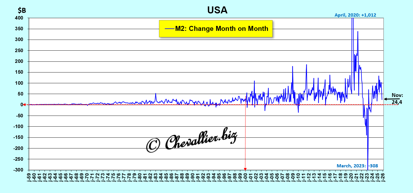 L’augmentation de l’agrégat monétaire M2 des États-Unis fluctuait dans une bande haussière depuis la fin de l’année 2022 mais elle a brusquement baissé au cours du mois de novembre 2025 au point de n’augmenter que de 24,4 milliards de dollars pour un total de plus de 22 000 milliards de dollars,