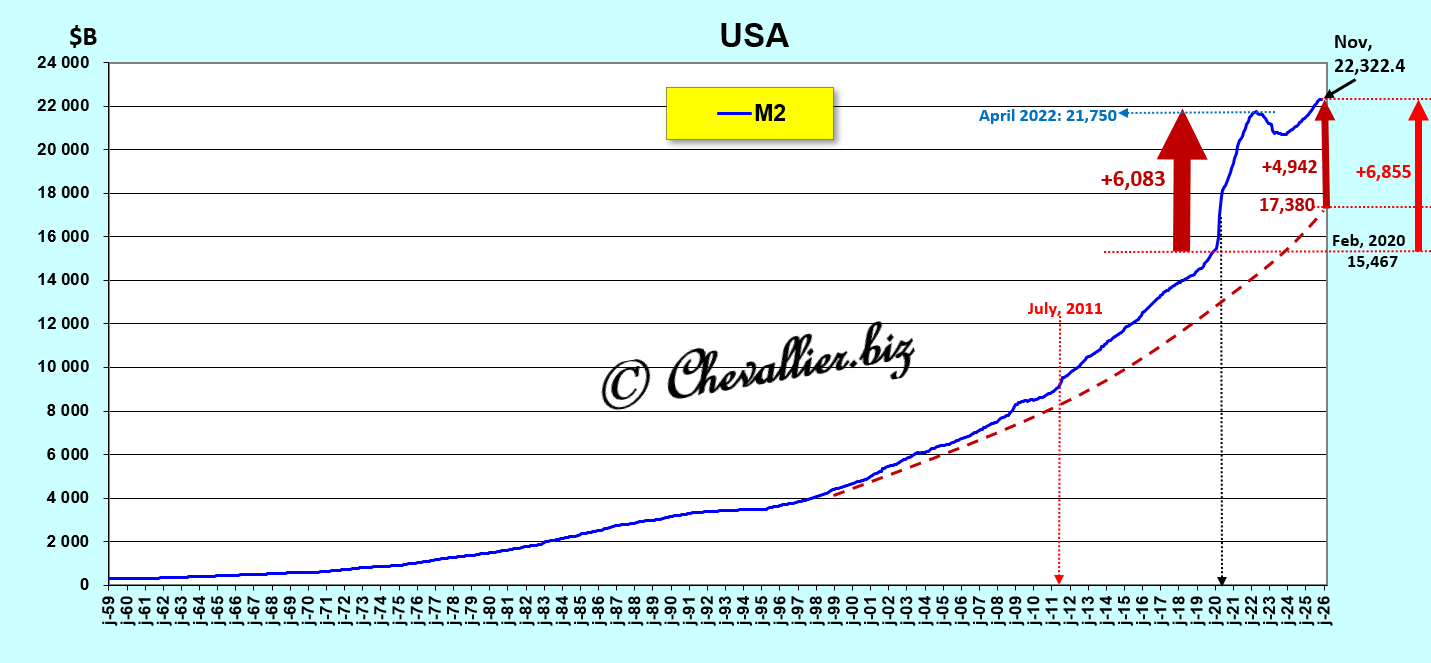 Fin novembre 2025, derniers chiffres publiés à ce jour, cet agrégat monétaire M2 a atteint un total de 22 322 milliards de dollars dont…4 942 milliards de dollars hors normes, surtout à cause de 6 083 milliards de dollars indus à la suite de cette histoire de coronavirus,