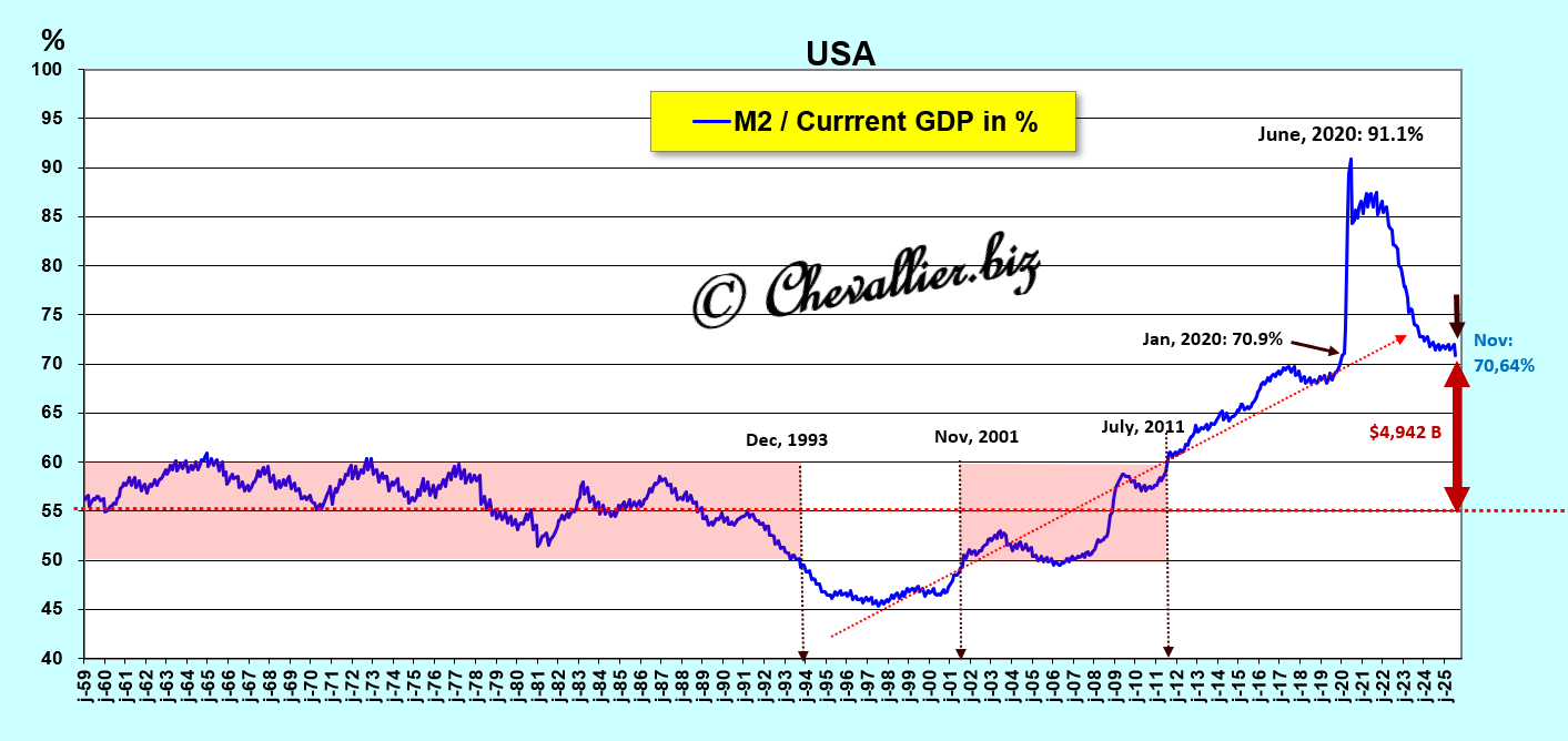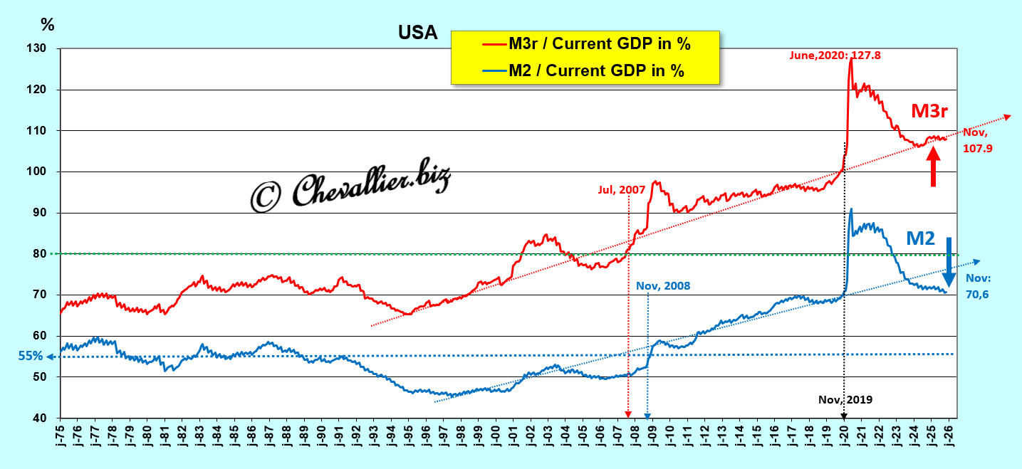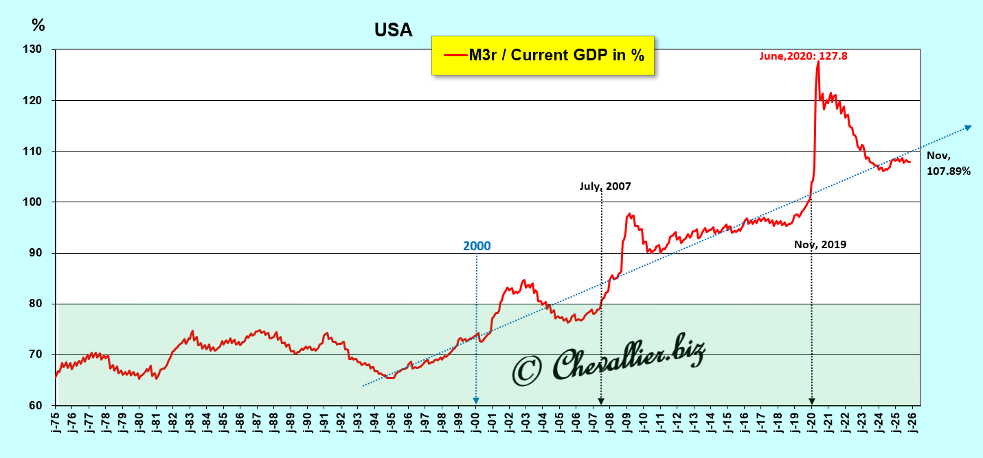 En effet, la baisse du ratio M2/PIB en pourcentage sur le mois de novembre 2025 est de faible ampleur et il est difficilement concevable qu’il revienne dans les normes dans un avenir envisageable,