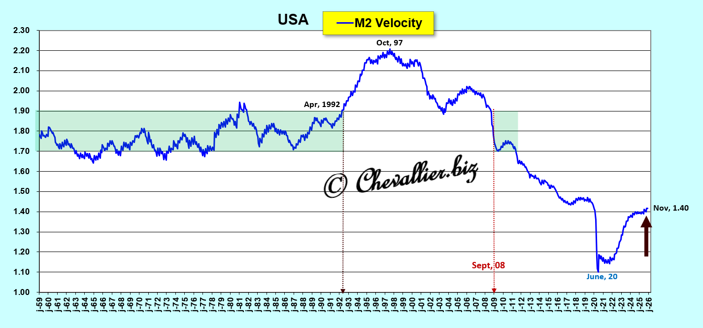 Evidemment, la vitesse de circulation de la monnaie calculée à partir de l’agrégat monétaire M2 augmente car c’est le rapport PIB/M2, c’est-à-dire l’inverse du ratio M2/PIB (en pourcentage)